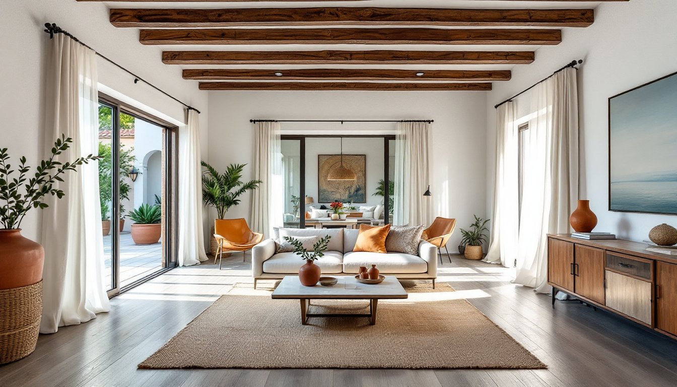 Think whitewashed walls (true lime wash or high-quality flat latex, not builder-grade eggshell), exposed beams in reclaimed or stained wood, and terracotta or wide-plank flooring. Furniture sits low and uncluttered, overstuffed sectionals are out: linen-covered sofas with visible wood frames are in. Metalwork shows up in wrought iron railings, light fixtures, and hardware, often with a matte black or aged bronze finish.