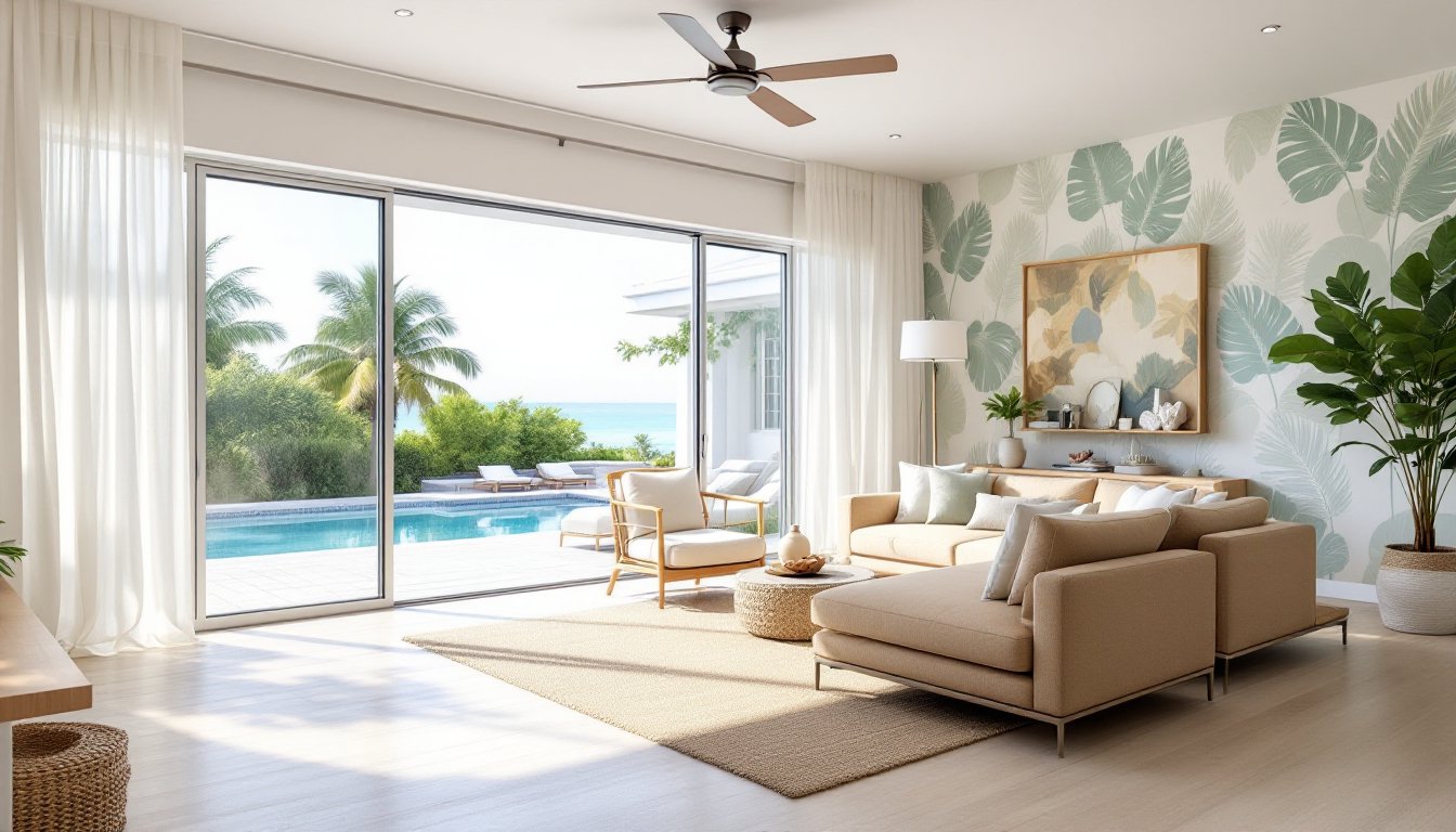 Tropical-inspired design pushes further into bold botanicals and organic textures. Large-leaf prints (monstera, banana leaf, palm fronds) appear in wallpaper, textiles, or artwork. Natural materials like jute rugs, bamboo shades, and stone accents reinforce the connection to the landscape. Ceiling fans aren’t just functional, they’re a design element. Look for models with DC motors (quieter, more efficient) and blade spans sized to room dimensions (52 inches for rooms up to 225 square feet, 60+ inches for larger spaces).